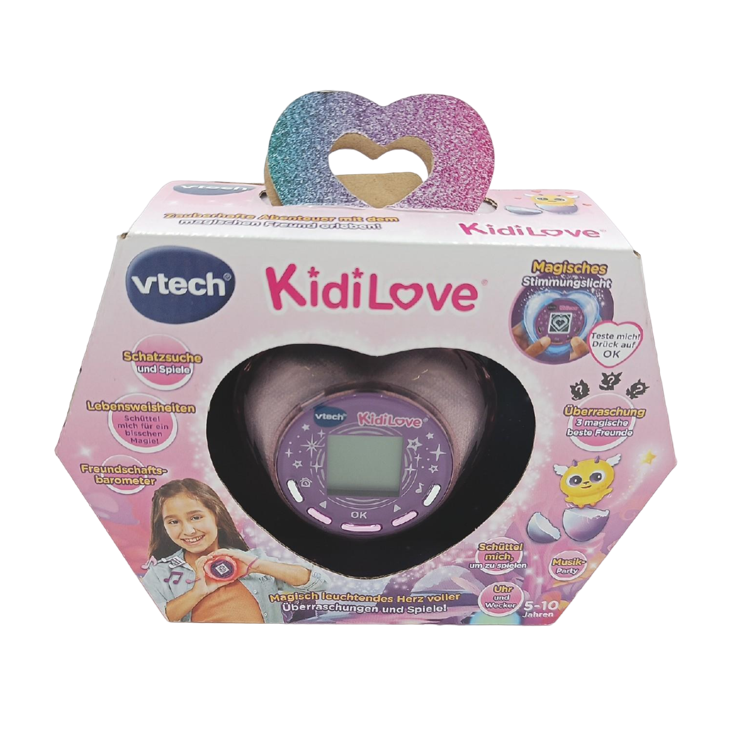 - Lieferumfang: 1 x VTech KidiLove / Virtuelles Haustier mit Lichteffekten, Musik und Spielen / Mit praktischer Schlaufe / Deutsche Version / Alter 5-10 Jahre / 3 x AAA/LR03 Demobatterien / Art. Nr.: 80-532504