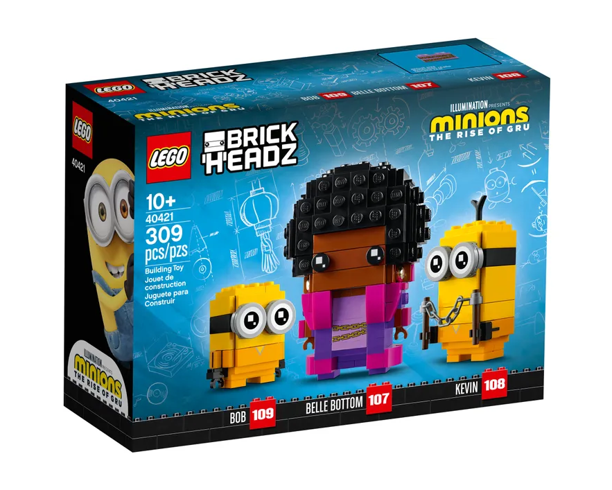 LEGO® BrickHeadz™ Belle Bottom, Kevin & Bob (40421) enthält 3 Figuren aus dem Minions-Film: Belle Bottom, den Minion Kevin und den Minion Bob mit Ausrüstung. Genau wie alle anderen Modelle aus der LEGO BrickHeadz Sammlung verfügen auch diese 3 Figuren jeweils über eine eigene Figurnummer und eine robuste Stellplatte, um als Einzelstück, als Gruppe oder neben anderen BrickHeadz Modellen präsentiert werden zu können.
