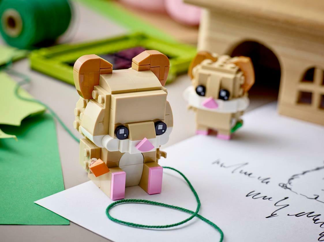 - Superputziges Bauset zum Sammeln mit LEGO® BrickHeadz™ Modellen eines Hamsters und eines Babyhamsters, die nebeneinander auf einer Stellplatte sitzen.