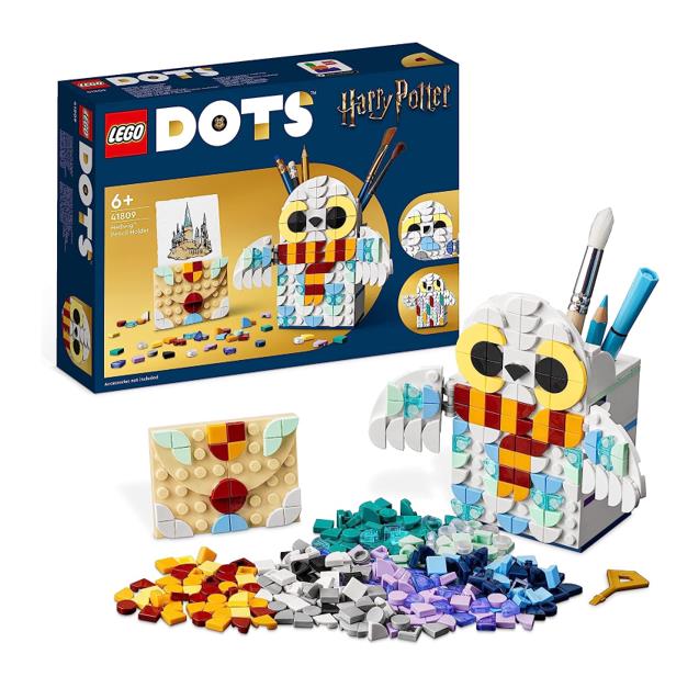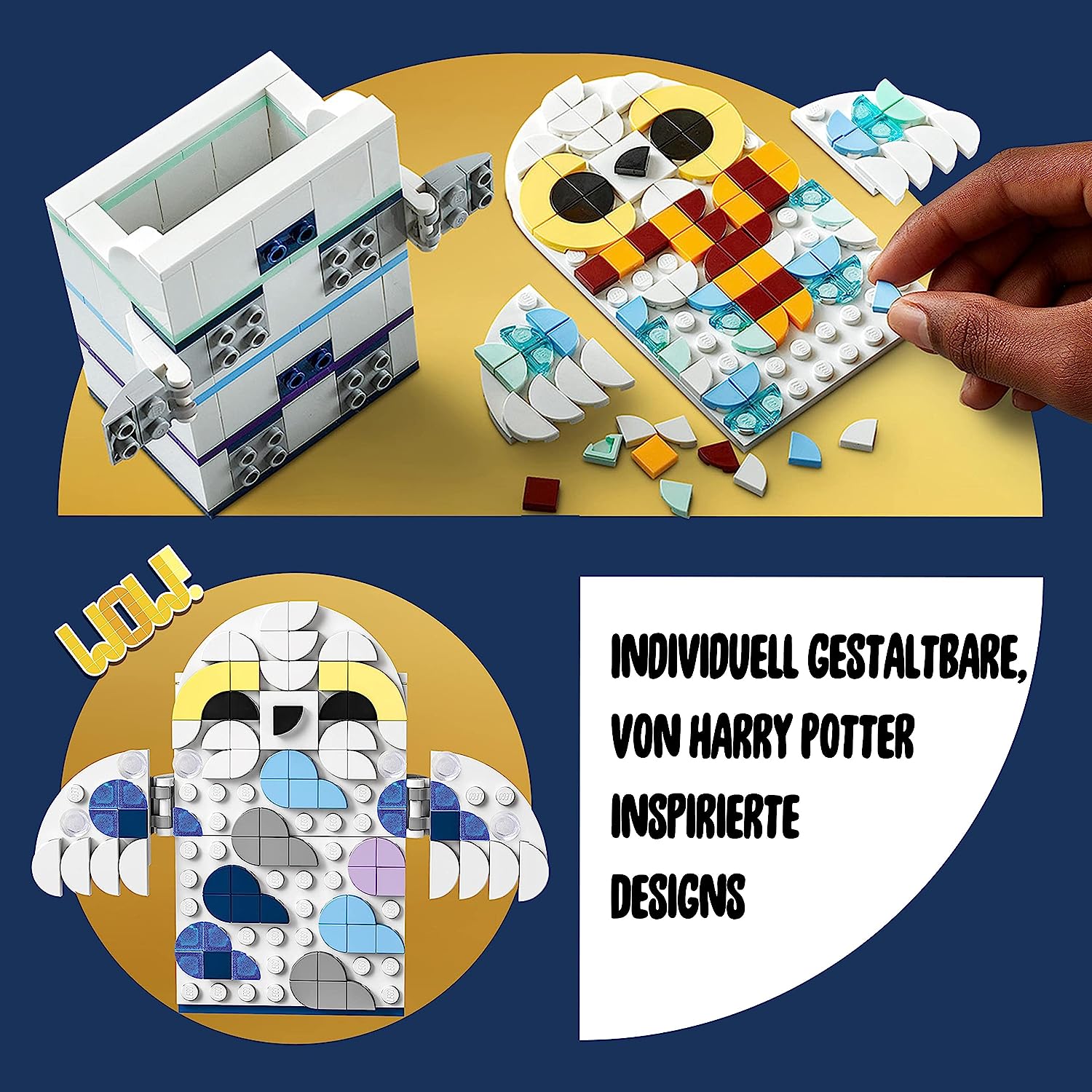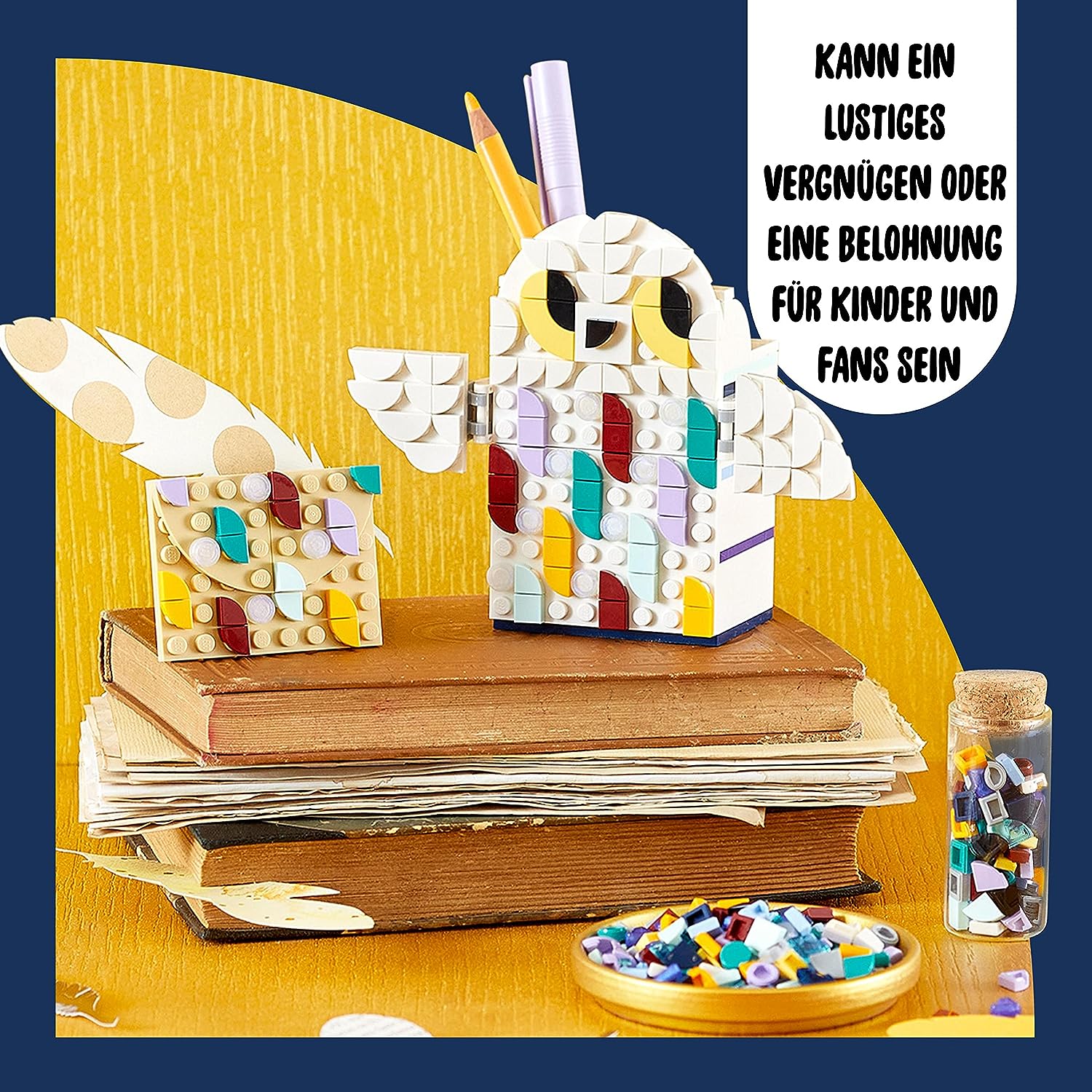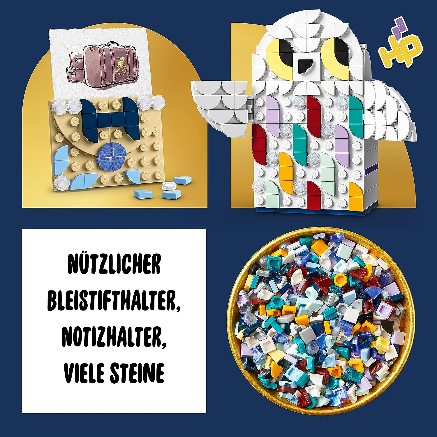 - Das LEGO DOTS Harry Potter Spielzeug enthält einen Bleistift-Topf in Form der Eule Hedwig sowie einen Zettelhalter und viele Steine