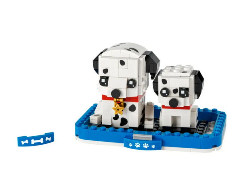 - Bauset zum Sammeln mit einem Dalmatiner und einem Welpen, die als witzige LEGO BrickHeadz Modelle nebeneinander in einem Korb sitzen.