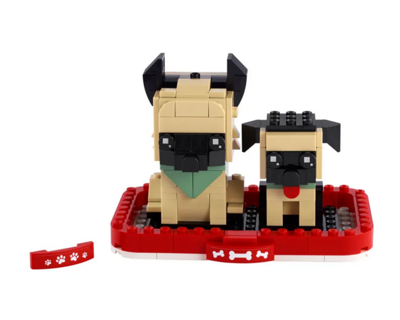 - Bauset zum Sammeln mit einem deutschen Schäferhund und einem Welpen, die als witzige LEGO BrickHeadz Modelle nebeneinander in einem Korb sitzen.