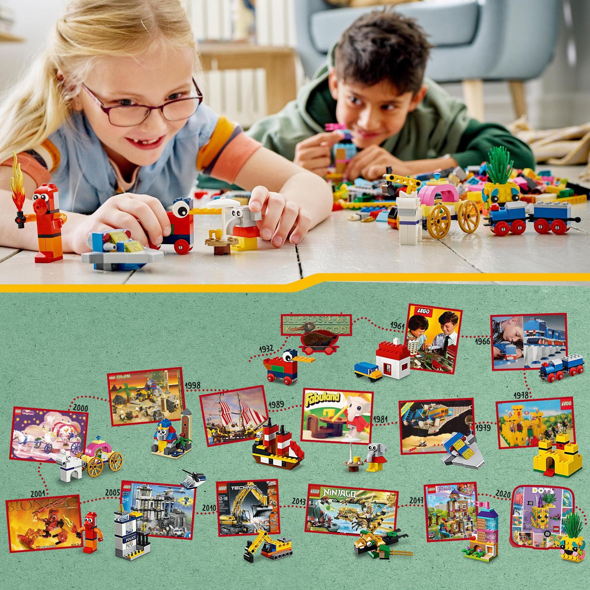 Kinder, Erwachsene und Großeltern können mit der LEGO Classic 90 Jahre Spielspaß (11021) Bausteine-Box endlose Stunden voller Spaß und Nostalgie erleben. Dieses LEGO Set enthält eine Mischung aus bunten LEGO Steinen und Teilen, 15 Mini-Modelle mit kultigen LEGO Spielzeugen aus den vergangenen Jahren, darunter ein Spielzeug-Schloss und ein Spielzeug-Zug, sowie zusätzliche Steine zum freien Bauen! Zu jedem der 15 Mini-Modelle gibt es eine bebilderte Schritt-für-Schritt-Bauanleitung, so dass auch Bauanfänger mit Stolz und Freude ihr eigenes Konstruktionsspielzeug bauen können. Bauspaß für Kinder ab 5 Jahren!Die LEGO Classic Baukästen geben Kindern Ideen und Inspirationen an die Hand, mit spannenden Modellen, die zu unbegrenztem Spiel anregen und Kindern helfen, kreative Fähigkeiten zu entwickeln, die ein Leben lang halten. Enthält 1100 Teile.